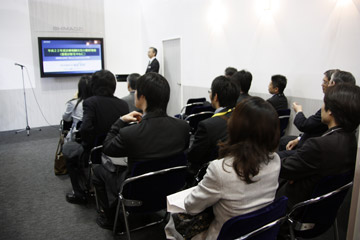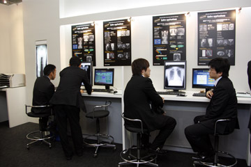 17インチの直接変換方式FPDを搭載したX線テレビシステム「SONIALVISION safire17」では,1回の断層撮影で任意断面の画像が得られるトモシンセシス,歪みのない長尺撮影が可能なスロットラジオグラフィ,エネルギー値の違いにより骨と軟部組織を分離することで,肋骨に隠れた腫瘍などの発見が可能なデュアルエナジーサブトラクションを紹介していた。トモシンセシスは現在,国立がん研究センター(旧国立がんセンター)と共同で肺がん検診への応用について研究が進められており,4月9日(金)には,産学連携セミナー「トモシンセシスの胸部がん検診に関する可能性」が行われ,森山紀之氏(国立がん研究センターがん予防・検診研究センター長)による「低線量トモシンセシスによる肺がん検診の有用性」と清水 薫氏(国立がん研究センター東病院放射線部)による「SONIALVISION safireによる低線量トモシンセシスの技術的評価」と題した講演が行われた。また,さらなる高画質を実現するとともに,環境にも優しい新FPDを紹介していた。