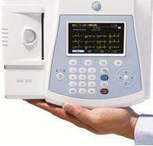 デザイン面では,サイズが208mm(縦)x 263mm(横)x 81mm(高さ),重さが1.2キロ(含バッテリー)と,これまでMACシリーズで最小・最軽量であったMAC800に比べて,約6割の小型化と軽量化を実現。小型ながら4.3インチのTFTカラー液晶ディスプレイを搭載することで,記録紙に出力することなく,解析結果をその場で確認できる。検査データはPDFファイルとして出力でき,ペーパーレスの運用も可能にしている。また起動時間は約10秒とMAC800に比べて1/2にスピードアップしたほか,MACシリーズ最長となる最大6時間の連続駆動が可能なリチウムイオンバッテリーを内蔵している。