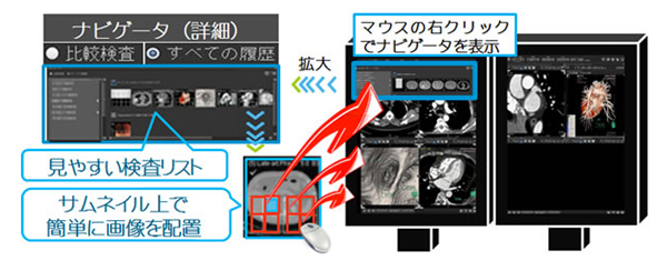Centricity PACS 4.0に搭載したナビゲータは,柔軟性の高い画面表示や直感的な操作で過去の撮影画像との比較読影を支援する機能で,従来は過去の画像を検索・選択して希望のレイアウトに配置するには,数多くの操作やマウスの移動を伴ったが,ナビゲータではサムネイルを活用した見やすい画面表示と,最少のステップかつ最短のマウス動線での画像操作を実現,大量の画像を最小限の労力で的確に操作できる。