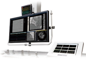 多数ある画像情報を,大型の56インチ高精細カラーLCDに統合し,タッチパネルで術者が容易にレイアウト選択できるシステム。表示したい画像を単に均等に割り当てるだけでなく,検査・手技に応じて,透視画像をクローズアップしたレイアウトやロードマップをクローズアップしたレイアウトなど自由にカスタマイズしたレイアウトを選択できる。
