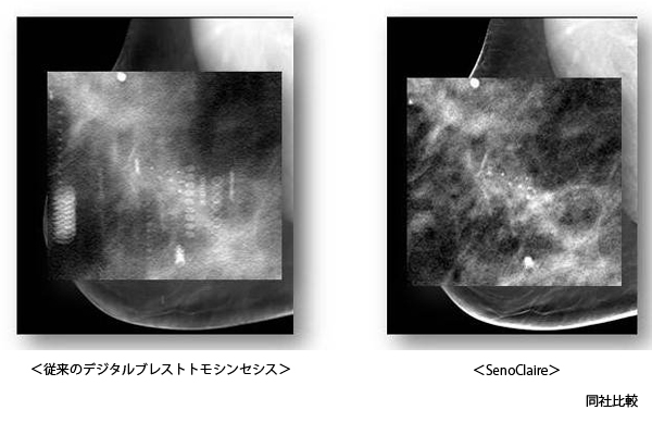 乳腺構造が発達して乳房領域が真っ白な領域で覆われる「デンスブレスト」は,欧米人に比べて日本人の乳房に高い頻度で出現する傾向にあると言われており,マンモグラフィによる撮像で白く描出される腫瘍との判別がしづらいという課題がある。「SenoClaire」は,このような従来のマンモグラフィの課題であった「デンスブレスト」の視認性を向上させ,要精検率の低減を可能にすることが期待される新技術である。画質とX線照射線量,圧迫時間のバランスを考慮し,検査時の乳房への負担を軽減させながら高精度なトモシンセシス画像を実現する。