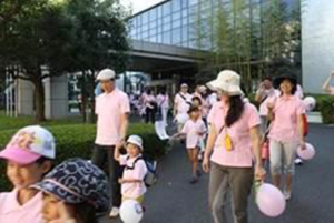 今年は,10月13日(日)に「healthymagination Walk(ヘルシーマジネーション・ウォーク)」を開催した。GEヘルスケア・ジャパンの社員とその家族70名でピンクリボンを形成する「ヒューマンリボン」を撮影した後,日野本社(日野市旭が丘)から自然体験広場仲田の森公園(日野市日野本町)までの約5km,時間にして約1時間半を歩き,乳がんに負けない社会をつくるための決意を新たにした。
