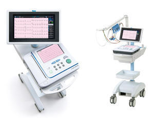 Cardico 1215 Dはデュアルディスプレイ(2画面)を採用することにより,メインディスプレイで「12誘導心電図波形表示」,サブディスプレイで「不整脈波形表示」といった異なる情報を同時表示することができ,検査に携わる医療スタッフの「異常波形の出現を的確に捉える」といった要求を新しい発想で実現した。病院の検査室や病棟・健診,診療所まで幅広く心電図検査をサポートする。