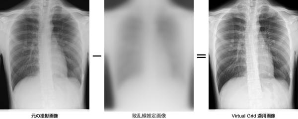 今回提供する「Virtual Grid」は,X線とデジタル画像に対する解析技術を組み合わせることで,散乱線成分を高速かつ忠実に再現する独自の「散乱線推定技術」を用いている。この技術により,撮影画像から推定された散乱線成分を,元の撮影画像から除去することで,散乱線により低下した画像のコントラストを高めることができる。さらに,「Virtual Grid」はグリッドの種類を変えた場合と同じように,画像のコントラストを調整することができ,また複数枚のグリッドの持ち運びや入れ替えが不要なので,作業性の向上を実現する。