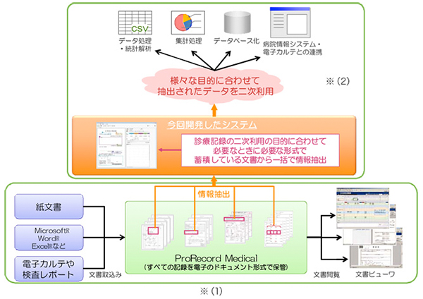同社は以前より,紙や電子のさまざまな形式の文書を汎用的な電子ドキュメント形式に統一し,原本性を担保して集中管理する「Apeos PEMaster ProRecord Medical(以下ProRecord Medical)」(図1 ※(1))を展開している。本システムは,ProRecord Medical で集中管理している記録から必要な情報を抽出しデータベース化するなど,既存の文書の二次利用(図1※(2))を可能にする。