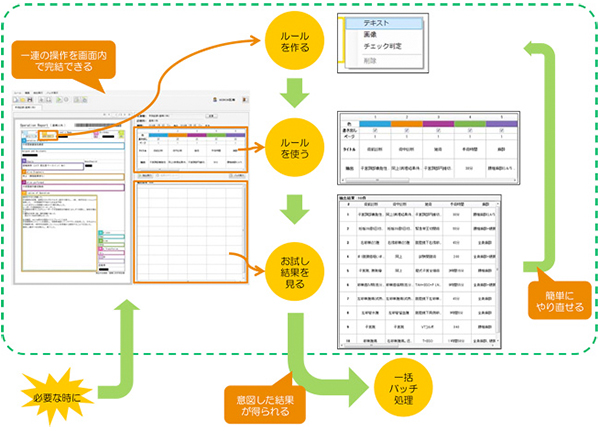 システムを作り込むにあたり,同社は津山中央病院と共同で本システムの評価実験を進め,システムの有効性を現場で確認してきた。共同実験では,必要な機能の検証に加え,ルールの設定方法に関しても実使用の中で検討を重ねてきた。システム導入にあたっては,実験段階で必要性が認められた機能の実現に加え,リアルタイムでプレビュー画面を見ながら抽出ルールの構築ができる(図2)などユーザビリティを強化した。他にも複数帳票の同時処理に対応するなど,実業務での使用に則した仕様を実現した。
