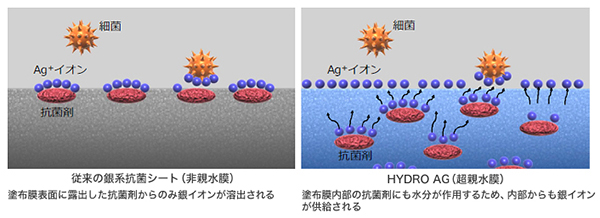 従来の銀系抗菌コートには,水となじみにくい非親水バインダーが用いられており,塗布膜表面に露出した銀系抗菌剤に水分が作用した場合にのみ銀イオンが溶出され,細菌の増殖を抑制していた。しかし,塗布膜表面にある抗菌剤の銀イオンは,抗菌作用を発揮するのに伴い消費される。また,塗布膜表面に何かが接触することで抗菌剤自体が物理的に脱落し,その抗菌効果は次第に失われてしまう。これに対し,「HYDRO AG」は,水と非常になじみやすい超親水性バインダーの中に銀系抗菌剤を分散しているため,塗布膜表面だけでなく,塗布膜内部の抗菌剤にも水分が作用して,塗布膜内部からも銀イオンを供給する。これにより,塗布膜表面の銀イオン濃度が高くなり,従来にない高い抗菌性能を発揮する。また,その効果が長期間持続することが期待できる。【図1】