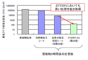 北里環境科学センターにおいて実施した,実際の室内に近い環境(気温25℃,湿度50%)で菌を付着させた抗菌性能試験においても,従来の非親水性バインダーを用いた銀系抗菌コートに対し,「HYDRO AG」は高い抗菌性能を発揮することを確認した。【図3】