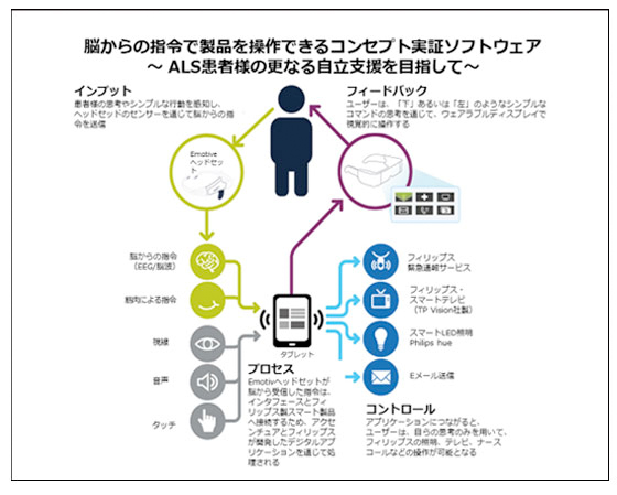 ロイヤル フィリップス(以下 フィリップス) とアクセンチュア は,8月22日,脳波を測定できるデバイス 「Emotiv Insight Brainware」 とウェアラブルディスプレイを接続したコンセプト実証ソフトウェア (以下 本ソフトウェア) を開発したことを発表した。本ソフトウェアは,筋萎縮性側索硬化症 (ALS) の患者さんをはじめとした神経変性疾患患者さんのより自立的な生活を支援する可能性のあるもの。年間40万人以上*1 が発症し,「ルー・ゲーリッグ病」*2 としても知られるALSは,脳と脊椎神経細胞を損傷させ,徐々に随意筋の働きを奪う難病である。末期の患者様の場合は,脳の機能は保持されたまま,全身麻痺の状態となることも多いとされている。