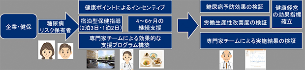 プログラムの参加者は,有名観光地のホテル・保養所にて,座学やグループワークを通じて正しい糖尿病の知識を学ぶほか,予防のための目標プランニングと生活改善のための食事および運動に関するアドバイスが受けられる。また,地域の特性を活かしたトレッキング体験やヘルシーな地元料理による健康的な身体作りなどを体験し,楽しみながらプログラムを受講する。宿泊型保健指導終了後は,管理栄養士や保健師などの専門スタッフが4~5ヶ月にわたり,リモートにて継続的に糖尿病予防を支援する。
