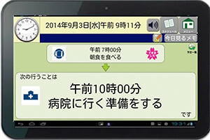 所定の予定時刻になると,何をするべきかを,文字と読み上げ音声で行動を促すことで,行動予定の健忘や,注意障害,遂行機能障害を補う。
