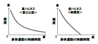 日立では,2004年から人間行動の客観計測技術の研究開発に取り組み,加速度センサ,対面センサが搭載された名札型のウエアラブルセンサ(「ビジネス顕微鏡」)で得た大量の人間行動データを解析することで組織状態の把握や企業の業績向上策を見出す手法を開発してきた*6。今回,7社,10組織,468人の従業員の業務中の延べ約5,000人日,50億点の身体運動を表す加速度データをウエアラブルセンサで取得し,集団の「ハピネス度」を示すデータとの相関解析を行った。加速度データについては,身体運動の持続時間に着目し,集団のハピネスとの相関を調べた。集団の「ハピネス度」には,米国国立精神保健研究所により開発され,世界中で普及している抑うつ傾向の自己評価尺度CES-D*7を元に算出したデータを用いた。これを集団(組織)ごとに集計し,その集団における身体運動持続時間の頻度分布との関係をみていくと,高ハピネスの集団では,持続時間の頻度分布が,富士山のように曲線を描きながら裾野が長く伸びる(富士山型)のに対し,低ハピネスの集団では直線的に低下している(絶壁型)ことが明らかになった。