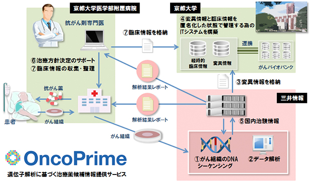 三井情報(株)(以下 MKI)は,患者のがん関連の遺伝子変異を解析することによってその患者に最適な治療薬候補等を提供し,医師の診断決定をサポートする「OncoPrime(オンコプライム)」を2015年4月より提供開始する。本サービスは,日本で初めて,網羅的がん遺伝子解析を臨床ベースで導入するもので,原発不明がん,希少がん,標準治療不応のがんの患者を対象として京都大学医学部附属病院から検査を受諾し,展開する。その後,段階的に全国の医療機関と提携を行い検査を実施することで,3年間で1,500件の検査実施を目指す。
