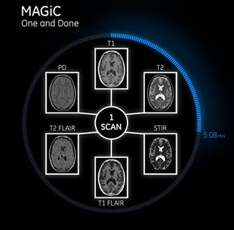 - 頭部ルーチン検査では,読影に求められるT1強調画像,T2強調画像などの各コントラスト画像に対して,その都度,撮像が行われている。SIGNA Pioneerでは,1回の撮像を行うことで,T1強調画像やT2強調画像を含む,6つの異なるコントラスト画像を取得できる「MAGiC」を業界初搭載。これにより,検査時間短縮による検査効率の向上,検査枠の増加等,今後のMR検査を変えていくことが期待される。画像は,一回の撮影で6つのコントラスト画像を取得でき,撮影時間も3分の1の約5分になることを示す。