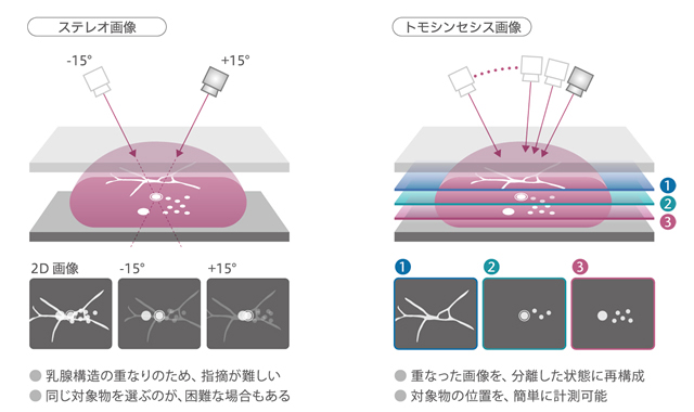 複数の断層画像を生成できるトモシンセシス撮影では,乳腺と腫瘤が重なっているなど通常のマンモグラフィ撮影では見つけにくかった病変の観察を行うことができる。本ソフトウェアを搭載すれば,病変が局所的に集まっている場合であっても,円滑なバイオプシーが可能となる。