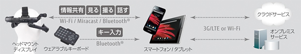 HMDと,AR統合基盤製品「FUJITSU Software Interstage AR Processing Server(フジツウ ソフトウェア インターステージ エーアール プロセッシングサーバ)」などのミドルウェアや,「FUJITSU BusinessApplication AZCLOUD SaaS teraSpection(フジツウ ビジネスアプリケーション アズクラウド サース テラスペクション)」などの業務支援サービスと組み合わせることで,画像や映像,音声による作業支援が可能。作業員は,HMDを装着し,作業手順や点検項目など作業に必要な情報をディスプレイに表示し確認しながら両手で作業を行えるため,チェックし忘れや手順間違いを防ぐとともに,業務効率を飛躍的に向上させることができる。付属のウェアラブルキーボードや音声コマンドにより,作業マニュアルのページめくりや数値入力,カメラ撮影などの本体操作も可能である。