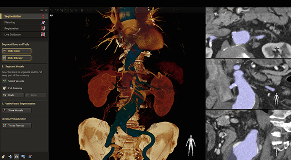 血管内治療術では,罹患した血管壁再建のためにステント等を目的部位へ配置挿入するために,イメージガイダンスを利用して主幹動脈または静脈を通してカテーテル治療を実施する。従来の2D X線イメージガイドを用いた場合,臨床医はこのような治療の際に,しばしば可視化された血管構造を3次元的に認識することが難しいため,処置の複雑さを増大させている。治療対象である血管部位を直接触れて視認できる従来の開腹手術がより馴染みが深いのは当然であるが,「VesselNavigator」は,開腹手術と同様に3次元構造を十分に把握したうえで治療を実施することを目指したもの。