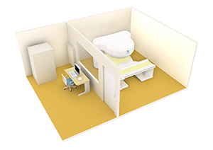 永久磁石MRI装置は,超電導装置に比べ,漏洩磁場範囲が小さく,また常時冷却する設備などが不要なため小さな面積での設置が可能。