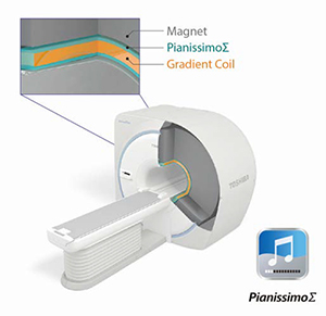 また,ハードウェア静音技術Pianissimo™ Σ(ピアニッシモ シグマ)と併用可能な静音シーケンス「QuietScan」を搭載,ハードウェア,ソフトウェア両面からの静音化により,拡散強調画像の撮像など,特に音の大きな検査も含め,すべての検査で高い次元の静音化を実現している。東芝は最新の撮像アプリケーションが開発される度に増大する騒音問題,特に超高速撮像時における騒音など,あらゆる検査に対応できる静音化技術で患者さんにやさしい静かなMRI検査を提供する。