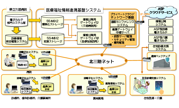 北三陸ネットに参加する各施設内で作成される情報を電子化し,施設間をつなぐ安全なネットワークからプライベートクラウドへ格納する事で,情報のバックアップが行われると同時に,各施設が相互に情報を閲覧できるようになる。共有する情報には,同意書により賛同した住民の診療記録や保険薬局の調剤履歴,紹介状,介護・福祉現場のケア記録,在宅診療や訪問診療,訪問介護時のメモや連絡事項などが含まれ,情報連携がスムーズに行えるようになることで,各施設におけるサービスの質の向上を目指す。これまで紙媒体で記録や保管することが多かった情報を電子化しバックアップすることで,災害にも強い地域づくりに貢献する。