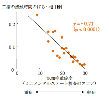長寿医療研究センターは,アルツハイマー型認知症およびその予備群の外来患者23名と高齢健常者22名を対象に手指の運動計測を行い,一般的な問診による認知症検査(ミニメンタルステート検査: MMSE*4)のスコアと高い相関があることを確認した。片手の指タッピング運動と認知症の関連は見られなかったが,両手交互指タッピング運動(図1)で健常群と認知症群の間に有意差があった(図3)。また,MMSEのスコアと相関が高い特徴量は,両手同時の指タッピング運動における両手の位相差*5のばらつき(相関係数*6r=−0.78)や,両手交互の指タッピング運動における二指の接触時間のばらつき(r=−0.71,図4)であることを明らかにした。これらは,指タッピング運動計測によって,アルツハイマー型認知症における脳梁*7や大脳基底核*8の委縮に起因する両手指のリズム運動機能の低下を捉えた結果であると考えられる。