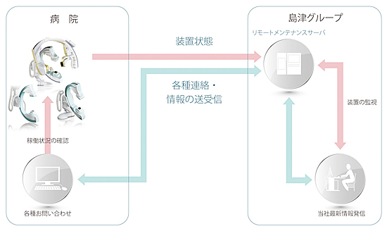 従来のリモートサービスを強化した本サービスは,同社の血管撮影システムを導入する病院と島津グループが管理するリモートメンテナンスサーバをネットワークで接続するもの。常に最適な状態に装置を保つために同社が装置の状態をリモートで監視し,ユーザーは,装置状態や保守記録の確認,装置マニュアルなどの閲覧,同社への問い合わせ,同社からの最新情報の受信などが院内のPCで可能になる。これまでは納入した装置の状態を同社が監視する一方向コミュニケーションであったが,本サービスを通して双方向のコミュニケーションを実現することで,さらに安心して日々の検査を行える。