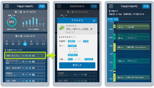 日立は,今回新たに,名札型ウエアラブルセンサーから収集した行動データを時間帯・会話相手などの項目で細分化し,これをHに入力することで,各個人にカスタマイズされた幸福感向上に有効なアドバイスを日々自動的に作成,配信する技術*2を開発した。利用者は,スマートフォンやタブレット端末上で,「Aさんとの5分以下の短い会話を増やしましょう」,「上司のBさんに会うには午前中がおすすめです」など,職場でのコミュニケーションや時間の使い方に関する多様なアドバイスを,日々確認できる。このアドバイスを実行することで,従業員一人ひとりの幸福感が高まり,それに伴い,生産性も向上することが期待される。なお,プライバシーに配慮し,個人のデータは他者からは閲覧できない形で管理する*3。