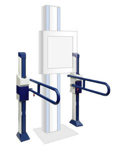 高齢者や,身体にハンディキャップのある方でも安心して検診できるよう開発。立位撮影台や受像部に付属している形状に比べ,耐荷重に優れ,様々な撮影に対応する。