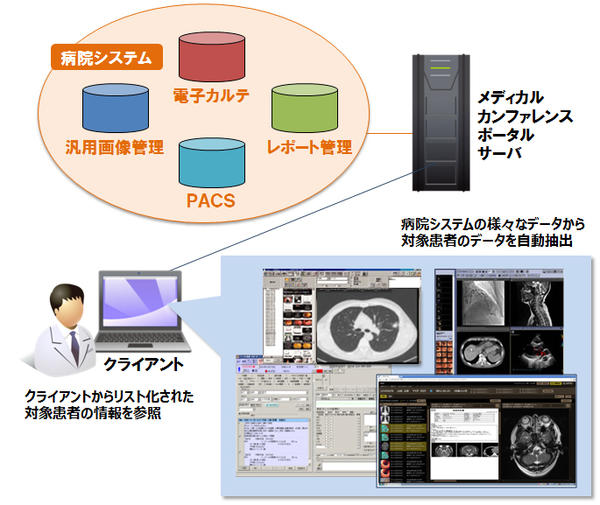 「メディカル カンファレンス ポータル」を導入することで,院内の電子カルテやPACS,画像管理システムなどの診療データベースからカンファレンスで指定した条件に合う対象患者に関連する情報群を自動抽出する。電子カルテの内容や所見レポート,CTやMRIの撮影画像,検体結果などをカンファレンスの指定条件に応じて表示させることができる。また,会議の進行と資料の参照を同時に行える直感的な操作性を実現しているほか,患者ごとのマトリクスビュー(時系列表示)やDICOM画像と汎用画像,所見レポートをひとつの画面内で複数表示させるなど,状況に応じた運用が可能です。準備作業の省力化とカンファレンスの効率化を実現する。