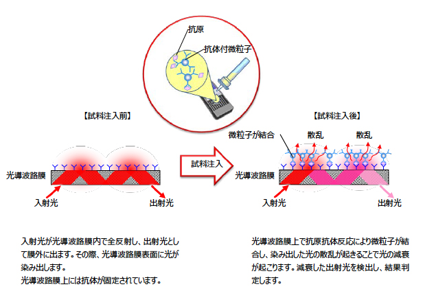 測定原理(図1)にあるように,検査カートリッジ内部にて,抗原抗体反応により捕捉された微量なインフルエンザ抗原を分析装置の光により検出する。これにより,鼻かみ液などのウイルス量の少ない検体種でも感度良く検出ができるため,患者さんの検査における負担軽減に貢献する。