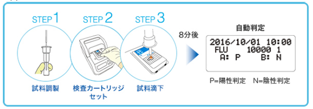 ウイルスの入った鼻かみ液などの試料と試薬を調製してから検査カートリッジに滴下するまで3ステップの簡単な操作(図2)なので,誰でも簡単に安定した検査が可能。測定時間は8分で,判定結果は分析装置が自動で陽性・陰性を判定し表示するため,従来品の課題であった目視による判定のばらつきを低減し,医療従事者の負担軽減に貢献する。