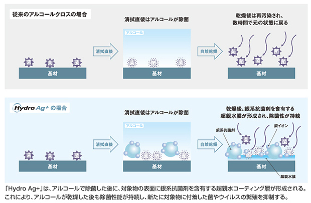 今回発売する持続除菌環境清拭材「Hydro Ag+アルコールスプレー」と「Hydro Ag+アルコールクロス」には,同社独自の抗菌技術「Hydro Ag+」により,アルコール溶液中に銀系抗菌剤と室温で硬化する超親水ポリマーが安定的に分散されている。医療現場などで本製品を使用すると,対象物がアルコール除菌されるとともに,対象物の表面に銀系抗菌剤を含む超親水コーティング層が形成され,アルコールが蒸発した後も長期にわたり持続的に微生物の繁殖を抑えることができる。また,形成されたコーティング層によって油・タンパク質汚れがつきにくくなる効果も得られる。同社は,銀イオンが継続的に放出されることで抗菌性能を長時間持続する,銀系抗菌剤を分散させた超親水性の樹脂を塗布する技術を開発し,同社医療機器に使用してきた。今回新たに,抗菌技術「Hydro Ag+」を開発し,本製品に採用することで,顧客自身が対象物を簡便に,銀系抗菌剤を含む超親水膜でコーティングできるようになった。