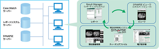 「SYNAPSE Case Match」は,富士フイルムの医用画像情報システム「SYNAPSE」のオプションとして使用されるシステムで,SYNAPSE Case MatchサーバとSYNAPSE Case Matchクライアントから構成される。また,別売りのレポーティングシステム「SYNAPSE Result Manager」とエキスパートビューワ「EX-V」を連携させることで,画像比較表示,参考症例データを利用したティーチングファイル作成とレポーティングシステムへの内容反映をシームレスに簡単操作で実施できる。