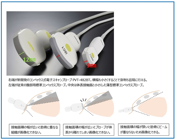 特に,新たに開発した,わずか9ミリ幅の世界最小体表接触面のコンベックス式電子スキャンプローブPVT-482BTは,肋間走査の際に体表との接触を保ちやすく(図1),またプローブ自体の重量を約40%削減(同社従来比)し軽量化したため,検査の効率を高めると共に検査者の負担を軽減する。
