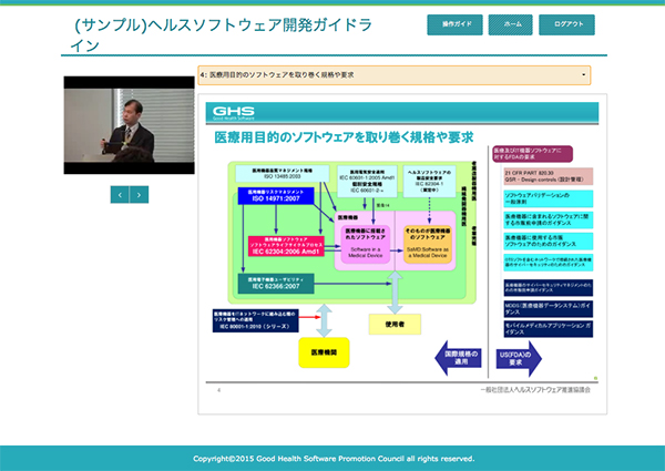 GHSは,「医薬品,医療機器等の品質,有効性及び安全性の確保等に関する法律(薬機法)」の規制対象外となる電子カルテなどのヘルスソフトウェアを安全・安心に利用できるよう,「ヘルスソフトウェア開発ガイドライン」を取りまとめ,これに沿って開発された製品にベンダーが「GHSマーク」適合宣言する制度を設けている。ビデオラーニングのコンテンツは,企業のGHSマーク登録のために,GHSが開催しているトレーニング講座の内容などを映像化したもの。地方在住などの事情によりトレーニング講座を受講できない人がいることを考慮して,インターネットで視聴できるようにした。