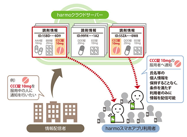 今回の配信サービスは,このharmoのシステムを活用して,患者氏名などの個人情報を含まないクラウド上の情報から特定の条件を満たす利用者を抽出して,利用者に直接情報の通知を行うもの。情報通知者もソニーも,患者の名前や電話番号,メールアドレスなどの情報を取得することなく配信サービスを運用できることが大きな特長となっている。ソニーは今後このシステムを利用して,様々な情報配信を展開していく予定。
