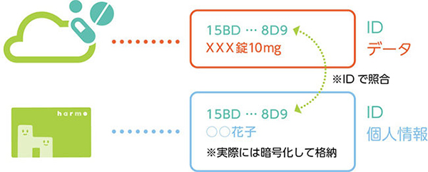 harmoはソニーが独自開発した情報分離技術を基礎とする,個人情報に配慮したクラウドシステムによりサービスを運営しており,患者氏名などの個人情報は専用のICカードやスマホアプリに,また調剤された薬剤情報などのデータはクラウドサーバーに,各々暗号化のうえ,分離して保存している。