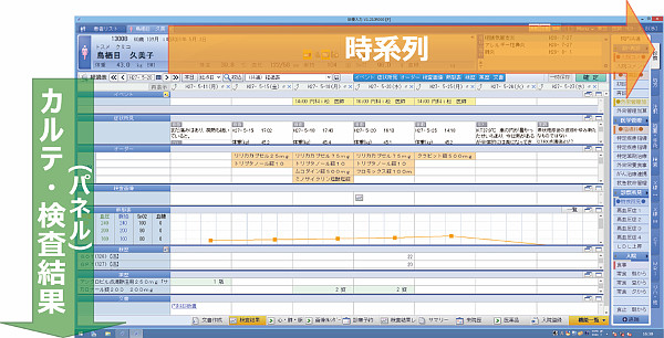 従来の紙カルテのイメージに近い見開き型カルテ表示に加え,新たに時系列による情報が一覧で表示できるため,即座に患者さんの状態を把握できるようになった。