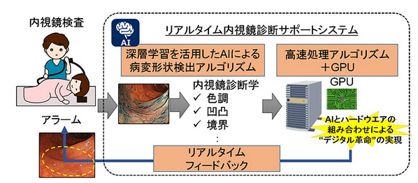 このリアルタイム内視鏡診断サポートシステムは,大腸の内視鏡検査時に撮影される画像で大腸がんおよび前がん病変をリアルタイムに自動検知し,内視鏡医の病変の発見をサポートする。また,臨床現場でリアルタイムに医師にフィードバックするため,画像解析に適した深層学習を活用したAI技術と独自の高速処理アルゴリズム,画像処理に適した高度な画像処理装置(GPU:Graphics Processing Unit)を用いて,1台のPCで動作するプロトタイプを開発した。