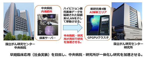 - 国立がん研究センター研究所・新研究棟4階に設置されたAI解析エリア(GPGPUクラスタ,注2)と中央病院内視鏡科の録画サーバーを,隔絶された閉鎖系VLAN(注3)で接続し研究を加速させる。