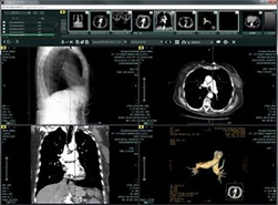 CTやMRIなどによる断層画像から高精度な3D画像を描出し,解析する医療向け3D画像解析システム。独自の画像解析技術により,簡単な操作で各種臓器,血管や微細な気管支などを高精細に自動で抽出し,高精度な3D解析を実現する。放射線科,循環器,消化器,呼吸器,頭頸部,泌尿器など幅広い臨床領域において,手術の事前シミュレーションやインフォームドコンセント,治療計画の検討などに活用され,臨床現場における技師の負担軽減や医師の読影業務の迅速化に貢献する。