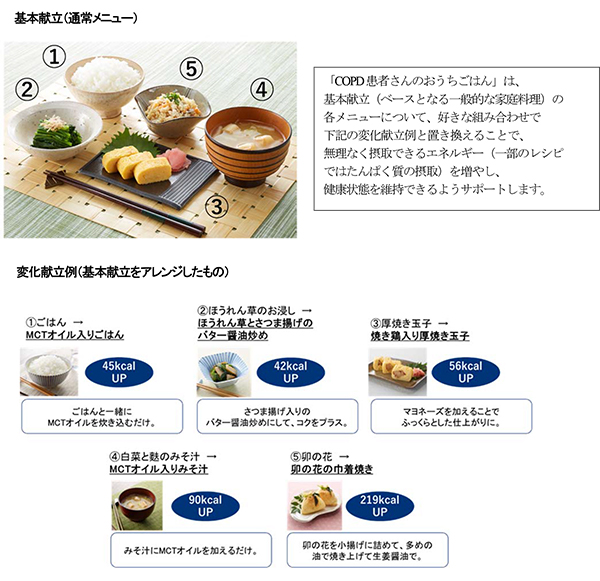 患者さんは,肺機能の低下で呼吸時のエネルギー消費量が多くなるため体重が減少しがちだが,これが呼吸不全の悪化を招くことがある。このため,一般より多くのエネルギー摂取が必要な一方,食事の際の息苦しさなどで,十分な栄養を確保できていない現状がある。今回,開発された患者さん向けレシピは,家庭で一般的に出されている食事に,エネルギーを上げる工夫を盛り込んだ。これにより,介護する方の負担を増やすことなく,患者さん自身も食事を楽しみながら,無理なくエネルギーを摂取し,健康状態を維持できるようサポートする。