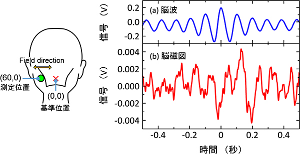 上記の高感度TMR磁気センサを用いることで,脳の活動由来が明確なα波の検出に成功した。α波は閉眼中に約10Hzの信号が後頭部に出現する。そこで,脳磁信号をTMR磁気センサで検出し,脳波のα波をトリガにして加算平均処理をした。図2-1はトリガ前後0.5秒程度の範囲における,脳波と脳磁図の比較である。両者は強い相関を示し,加えてTMR磁気センサの感度軸の向きを180度回転させたときに,信号の位相が反転する様子もとらえられたことから,α波由来の脳磁図であることが示された。SQUID以外の素子において,室温で簡便に動作する素子を用いて脳磁図を測定したのは,これが世界初となる。現在までに取得できているα波由来の脳磁信号強度は,加算処理後に2 pT程度にとどまっているが,脳磁源への近接効果による推定値は数十pTであり,測定環境や位置を最適化することで,より大きな脳磁信号を捉えることができ,脳磁図検出の検証精度も向上すると考えられる。