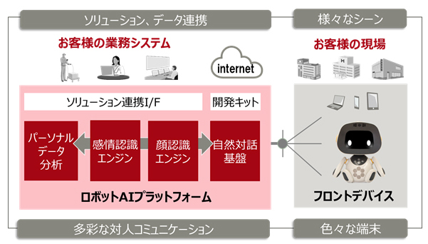本プラットフォームは,自然対話,表情認識,音声感情分析,顔認識などのコミュニケーションに関わるAI技術を搭載し,ロボットなどのデバイスと接続したクラウドサービスとして提供する。接続先のロボットは,窓口業務や高齢者介護など様々な現場で個人の状態や嗜好にあった自然対話によるコミュニケーションサービスを実現。本プラットフォームを,顧客の既存システムに連携させることにより,顧客自身の業務や提供するサービスに,ロボットによる付加価値を加えることが可能となる。