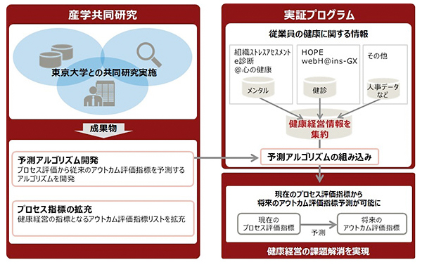 本共同研究では,東京大学川上研究室が保有する健康関連の様々な調査データや文献をベースに,これまで不明確だった「プロセス評価指標」と「アウトカム評価指標」の各評価指標間の相関関係を導き出すアルゴリズムを開発する。さらに,そのアルゴリズムと,同社のヘルスケア関連ソリューションで蓄積される企業内のデータを活用し,現在の「プロセス評価指標」から将来の「アウトカム評価指標」を予測する実証プログラムを開発する。