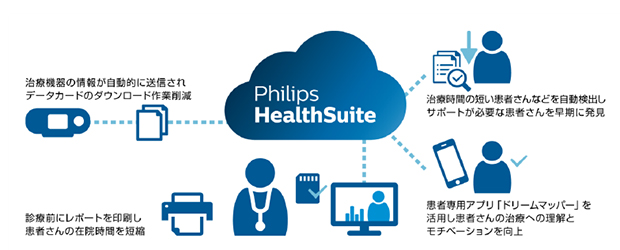 フィリップスでは健康・医療分野におけるデジタル化とモバイル化を推進しており,HealthSuiteはその基盤として構築されたヘルスケアに特化したデジタルプラットフォーム。フィリップスはHealthSuiteを通じてヘルステック業界全体のイノベーションを加速させ,健康な生活,予防そして医療における多くの課題に対するソリューションを生み出すことを目指している。「ケア オーケストレーター」は,このHealthSuite上で稼働する国内初のソフトウェアであり,クラウドコンピューティング環境で稼働する呼吸装置治療支援プログラムとして,厚生労働省より薬事承認を受けている。