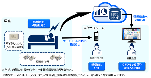 なお,本ソリューションの販売開始に先駆け,特別養護老人ホーム「ニューバード」が協力し,実証実験を,2017年10月〜12月に実施した。本ソリューションにより,被介護者がベッドから立ち上がる際の転倒やベッドからのズレ落ちを未然に防ぎ,また,寝る時間や起きる時間等の生活リズムが見える化されたことで,介護支援を効果的に行うことができ,一定の効果をあげることができた。