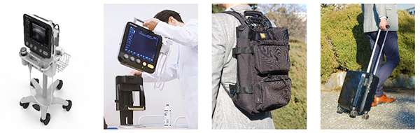 「SONIMAGE MX1シリーズ」では,院内での使用に便利な,可動性の高いポールカートとデスクトップスタンドを用意している。また,持ち運びを想定して,リュックやショルダーにできる3WAYタイプのキャリーバック,機内持ち込み可能なスーツケースタイプのハードケース,画面を保護するディスプレイカバーなどのオプションを用意している。
