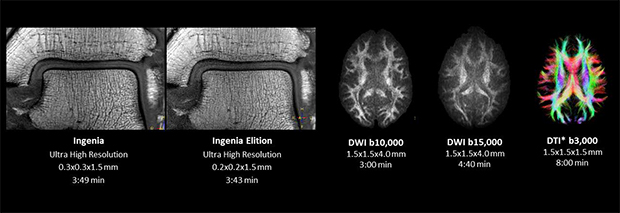 ハイパフォーマンスグラジエントが搭載されたIngenia Elition 3.0Tは,次世代の高速撮像技術であるCompressed SENSEとの組み合わせにより50%*1以上の撮像時間の短縮を実現するとともに,同じ撮影時間で今まで以上の高空間分解能化を図ることが可能となり,診断に確信が持てる画像を提供する。