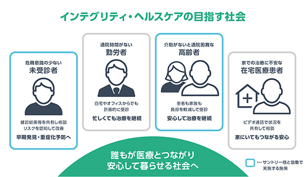 インテグリティ・ヘルスケアは,「人とテクノロジーの融合」により,全ての人々が自ら健やかな心身であることを大切にする社会,そして病を抱えても,年齢を重ねても安心して暮らすことができる社会インフラの創造を推進していく。